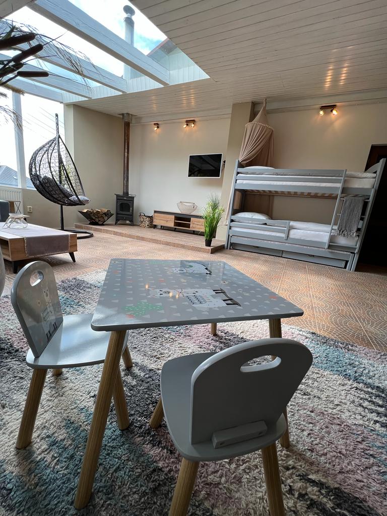 Velký pokoj s dvoulůžkem a patrovou postelí – perfektní pro 2 dospělé a 2 děti nebo 4 děti. Navíc je zde možnost přistýlky na rozkládacím gauči. Tento pokoj lze využít i jako společenskou místnost, kde najdete TV, krbová kamna, houpací křeslo a pohodlný gauč.