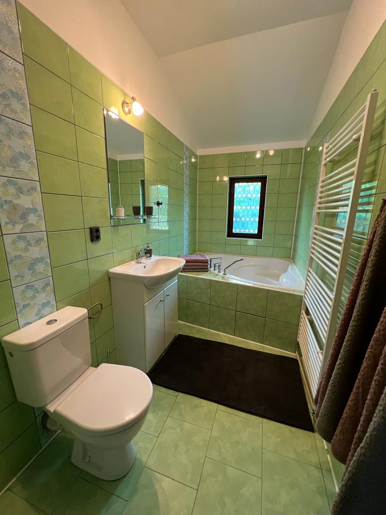 Koupelna s vanou a WC, kde máte k dispozici tekuté mýdlo, toaletní papír, ručníky a fén na vlasy.